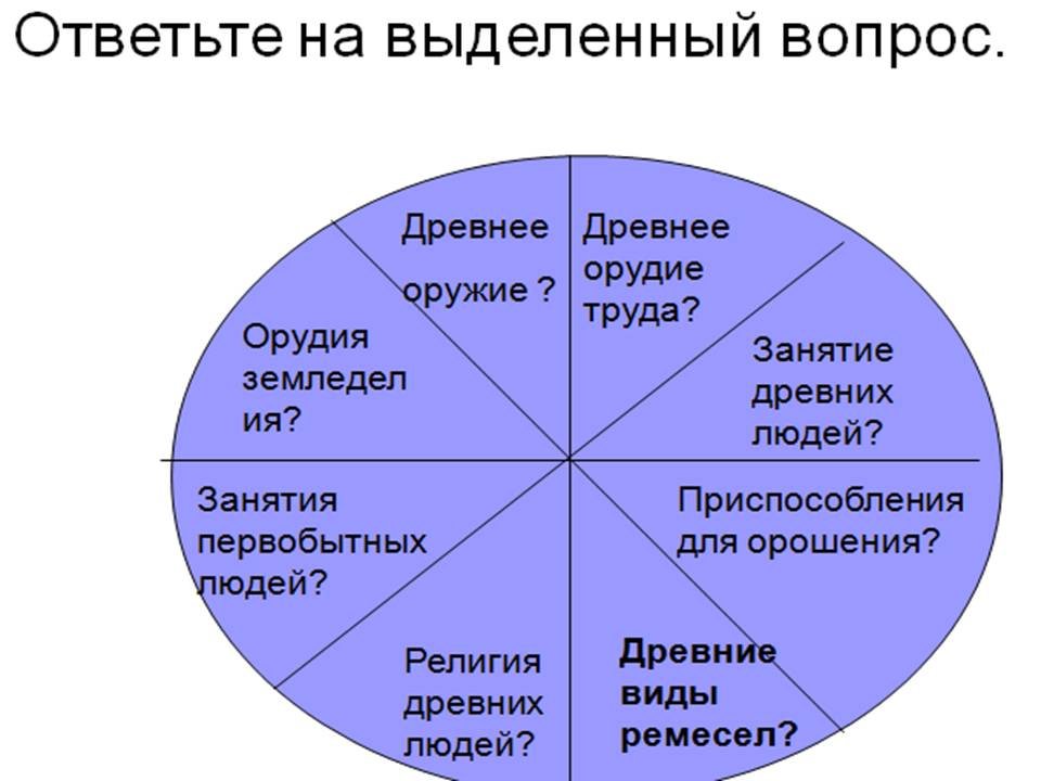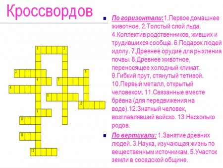 1. Где, по предположениям учёных, жили древнейшие люди? (В Восточной Африке) 2. Первый коллектив древнейших людей. (Человеческое стадо) 3. 40 тысяч лет назад человек стал…(«человеком разумным») 4. Умение изображать окружающий мир в красках. (Живопись) 5. Глава рода. (Старейшина) 6. Просьба к богу, духу. (Молитва) 7. Первый металл, который научились обрабатывать люди. (Медь) 8. Коллектив, пришедший на смену родовой общине. (Соседская община) 9. Главное отличие первобытных людей от животных. (Умение изготовлять орудия труда) 10. Первые занятия людей - это собирательство и…(охота). 11. Для охоты на мелких и быстро бегающих животных человек придумал…(лук и стрелы). 12. Вера в колдовство, душу, в жизнь после смерти. (Религия) 13. Несколько родовых общин. (Племя) 14. Умение из различных материалов изготовлять фигуры людей или животных. (Скульптура) 15. Какое занятие возникло из охоты? (Скотоводство) 16. Кого изображали первобытные художники? (Животных)