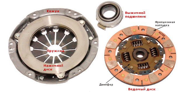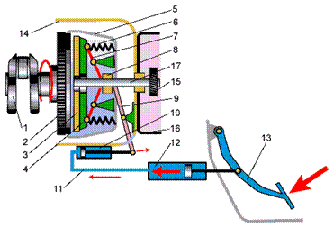 1 – иінді білік; 2 – тегергіш; 3 – жетектегі диск; 4 – қысатын диск; 5 – іліністің қаптамасы; 6 – қысқыш серппе; 7- иінтірек; 8 – қысқыш мойынтірек; 9 – іліністі қосқыш аша; 10 – жұмыс цилиндірі; 11 – түтік; 12 – басты цилиндр; 13 – іліністің басқышы; 14 – іліністің картері; 15 – тістрегіш; 16 – беріліс қорабының картері; 17 – беріліс қорабының білігі