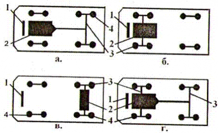 а, б, г - мотор автомобильдің алдында немесе; в - артында орналасқан, жетекші дөңгелектер; б – алдыңғы; в - артқы немесе г - екі білікте де орналасқан; 1 – радиатор; 2 – мотор; 3 - жетекші біліктер; 4 - дөңгелектер.